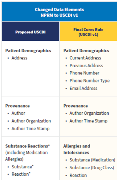 USCDI Version 1 differs from the Proposed Rule USCDI, as follows: