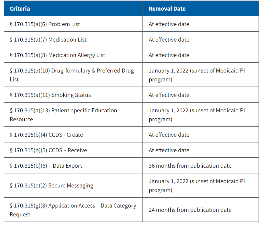 There’s actually some good news for EHR vendors looking to certify or re-certify in that some criteria from 2015 Edition CEHRT have been removed effective 60 days after publication (at effective date):